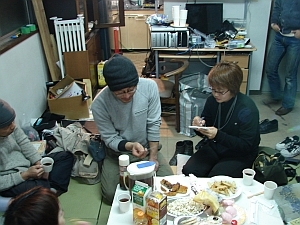 1月31日のてれれ上映会は「中崎町上映スペース」で行われました。 SDCCスタッフ3名と、ジュゴンアニメの制作者の計4人で出かけました。 参加者は全部で12名でした。 靴を脱いで上がりこみます。ホットカーペットがうれしい・・・。 揚げたてのフライドポテトやトンカツなどごちそうが並んでいます。でも残念! お腹いっぱい食べてきたところで、これ以上入らない。 この日は、神戸新聞社の方が来られて取材もありましたが、取材といっても仲良く一緒におしゃべり、という感じでした。 |