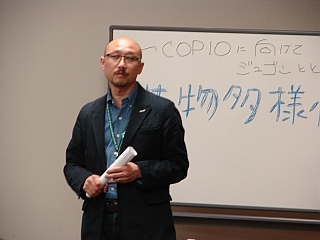 最初の講師は原野好正さん。 CBD(生物多様性条約)市民ネットワーク(CBD市民ネット)の運営委員をされています。 |