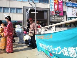 京橋駅前に到着。京阪モール前で署名です。 子供たちが集まります。 |