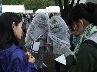 やっぱり 来場者も少なめ・・しか〜し、傘をさしながらも署名集めスタートです 外人さんにも HELLO |