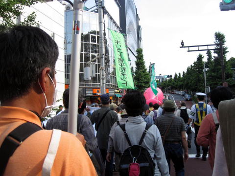 デモのコースは集会会場を出発して、若者が多く集まる原宿駅前から表参道の並木道を行進し、渋谷駅前を通り宮通公園まで1時間のコースでした。 |