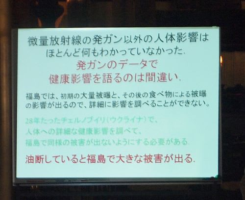 |  | ウクライナでは他にも、様々な健康障害が出ていますが、放射能のたまりやすいキノコ、ベリー類を肉や乳製品などに置き換えることで、かなり改善されるそうです。 小若さんは、「ガンにならなかったとしても、健康被害は出る。 放射能をからだの中に入れない事が大事」とおっしゃっていました。 命を大切にする世界を取り戻すために、沖縄−大阪−フクシマを結んだ心に響くイベントでした。  ZAN |