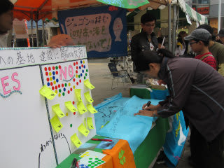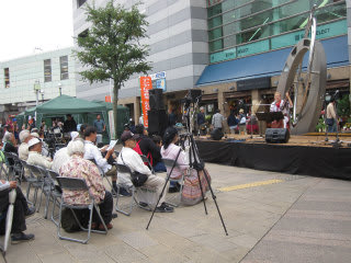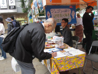 | 10月10日(土)、神奈川県の小田急線大和駅東側プロムナードで開催された 「ピースフェスティバルin大和・綾瀬2015」にブース参加してきました。 「アジアに平和を! 静かな空を!」の願いを込めて毎年開催されており、 今年で14回目になりました。 模擬店では、沖縄物産、有機野菜、焼きそば、焼き鳥、タイ料理などが出店。 ![]() 基地問題を考えるパネルは、今年は辺野古の新基地を許すなのパネルと、爆音訴訟のパネルが 展示されていました。 ![]() 最初のステージは、相模原を本拠地に厚木、南林間、つきみ野などのカルチャーセンターでの ダンス教室に集う子ども達のダンスパフォーマンス。5つのグルーフが日頃の成果を一生懸命 披露していました。子どもの晴れ姿を観ようと家族連れで通路までいっぱいになりました。 ![]() ダンスの後のコンサートの最初は、昨年も出演した ウクライナのカテリーナさん。 民族楽器バンドゥーラを奏で、古曲や民謡、日本の ポップスなど唄われました。 ![]() フィリピンの伝統音楽を唄うフィリピン人バンド 「ルマットwithアリソンパオン」の皆さん。 クリンタン(打楽器)やヘガロン(弦楽器)などの 民族楽器も披露。今年はソロ活動しているアリソン さんも加わっての演奏でした。 ![]() 今年も出演の沖縄出身のヨシミツさんと広島育ちのナビィさんの二人。寿(kotobuki)を結成して 今年で30年。音楽による人権、環境、平和など市民活動をしています。 安里屋ユンタの歌からスタート。 「寿結成30年」のオリジナルソングを唄うと、アリソンさんら フィリピンのメンバーが曲にあわせて踊りだしました。 最後に、安里屋ユンタで、会場の皆さんが踊り、コンサートは終わりました。 ![]() コンサートの途中で、出店している団体からのアピールが ありました。 SDCCも沖縄のジュゴン保護署名のお願いとグッズ販売と、 翁長沖縄県知事が辺野古埋め立て承認取消しを表明する ことを報告しました。 ![]() 今年も、グリーンアクション埼玉さんと一緒のテントで出店しました。 ”今年も来たよ ”と、常連さんがとグッズを買いに来てくれました。署名も進んでしてくださる方 など、SDCCのブースも定着したようです。うれしいですね。 ![]() ピースアクション埼玉さんのブースでは、辺野古に持っていくバナーにメッセージを集め、 辺野古に基地建設 賛成反対の投票をしていました。もちろん反対がダントツでした。 曇り空で少し寒かったですが、楽しい一日でした。 |